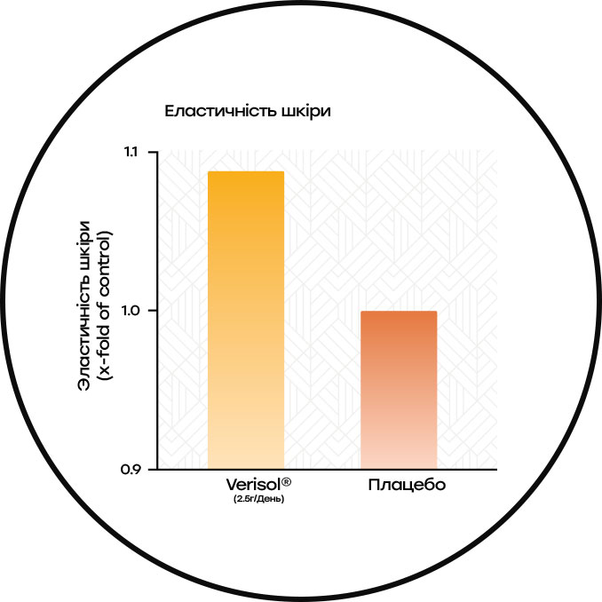 Колагенові пептиди VERISOL®, доповнені біотином, вітаміном С, ніацином, цинком та міддю, впливають на метаболізм колагену безпосередньо зсередини організму та запускають механізм вироблення власного колагену. Це дозволяє підтримувати адекватний рівень зволоження шкіри, затримує утворення зморшок та розтяжок.